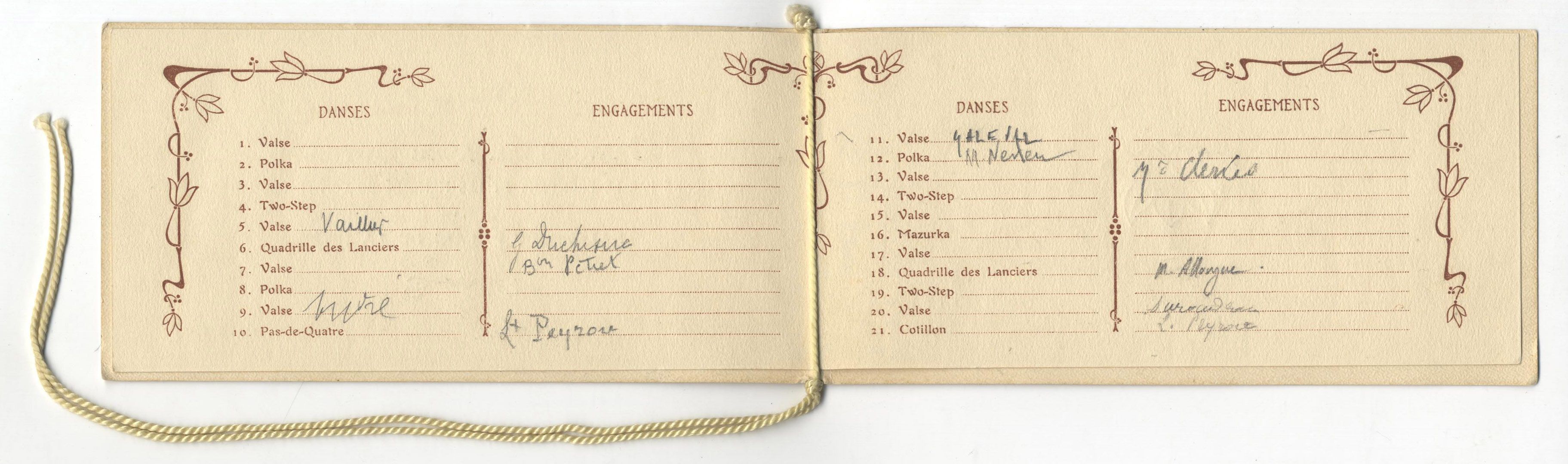 Pour encadrer ces rencontres existe le carnet de bal. Les premiers modèles ne sont guère luxueux : une simple feuille pliée en deux, imprimée en série pour les bals de nuit ou de matinée organisés par les « sociétés ». Le terme désigne alors des amicales, des sociétés mutualistes, des associations professionnelles ou régionales, qui structurent la vie sociale des villes et des quartiers. Sur le carnet figurent, soigneusement numérotées, les 30 ou 40 danses prévues au programme : valses, polkas, quadrilles, parfois un cotillon final. En face de chaque numéro, on inscrit le nom du danseur retenu.