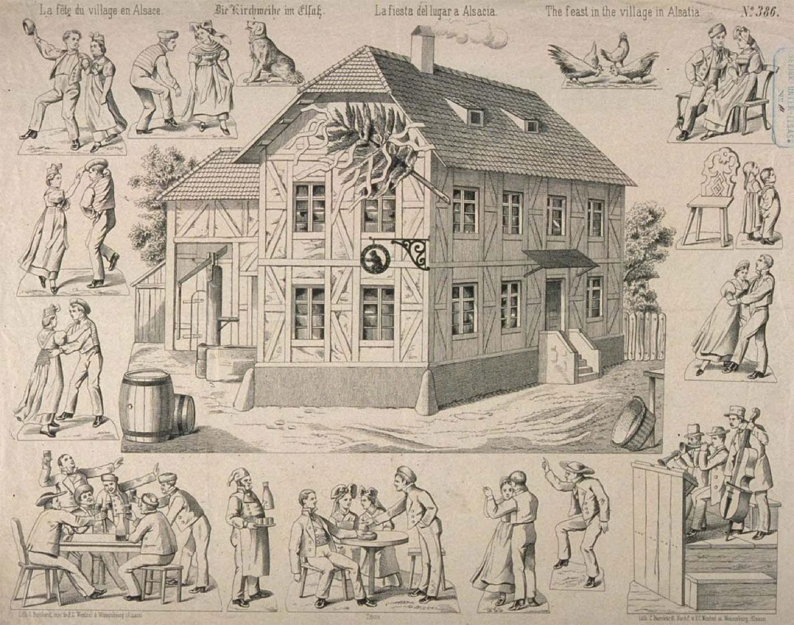 Cette planche publiée en 1883 représente une fête villageoise alsacienne telle qu’elle se pratiquait couramment au XIXᵉ siècle. Organisée autour de l’auberge, lieu central de la vie collective, cette fête annuelle rassemble habitants de tous âges pour danser, partager un repas et célébrer un temps fort du calendrier local, souvent lié à la fête patronale ou à la consécration de l’église. Sans désigner un village précis, l’image documente des usages profondément ancrés dans la vie rurale alsacienne.