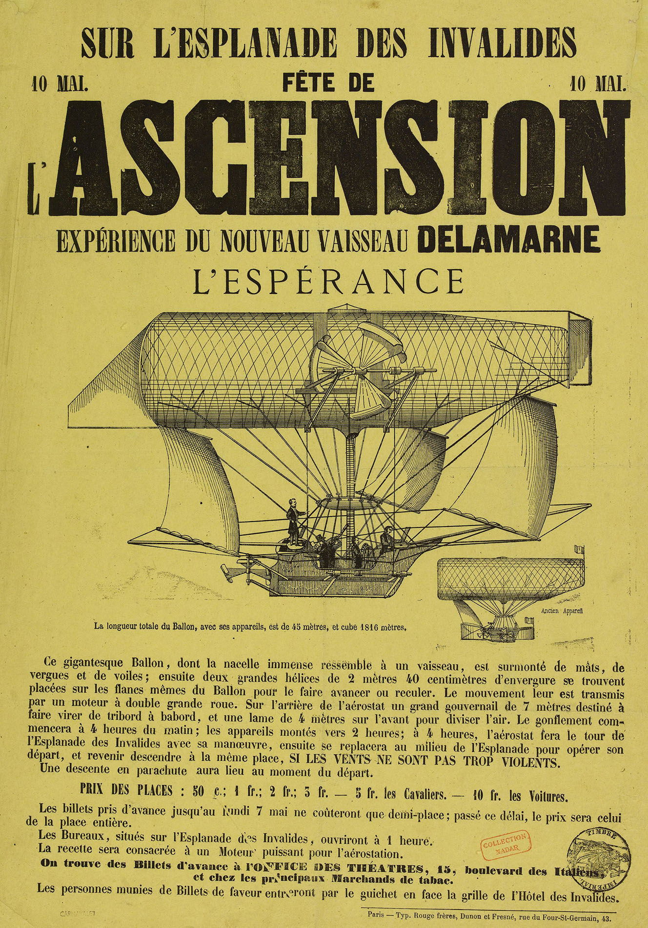 À Paris, un 10 mai choisi pour son affluence, l’esplanade des Invalides accueille une expérience publique consacrée à un nouvel aéronef conçu par Delamarne et baptisé L’Espérance. Présenté comme un “vaisseau” capable non seulement de s’élever mais aussi de manœuvrer, l’appareil est annoncé comme une avancée technique. La journée est organisée autour d’un déroulé précis, dépendant des conditions météorologiques, et comprend des démonstrations visibles du public, dont une descente en parachute. L’événement, payant et structuré comme un spectacle, s’inscrit dans la tradition des grandes expériences publiques parisiennes du XIXᵉ siècle, mêlant curiosité, technique et rassemblement populaire.