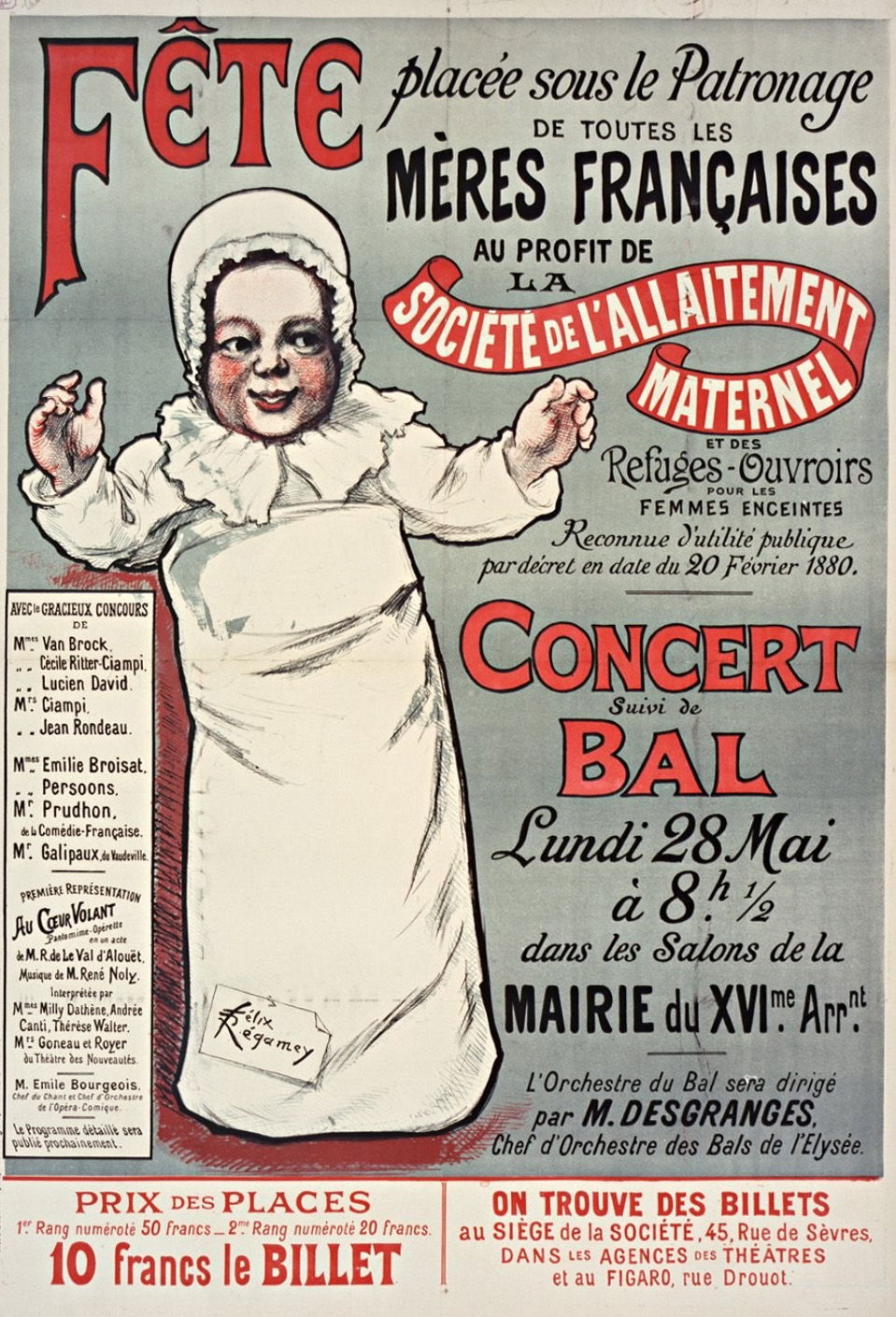 Fête placée sous le patronage de toutes les mères françaises au profit de la Société́ de l'allaitement maternel et des refuges-ouvroirs pour les femmes enceintes. 1894. Concert suivi de bal, lundi 28 mai. On trouve des billets au siège de la Société́, 45 rue de Sèvres. Régamey, Félix (1844-1907). Illustrateur. Source gallica.BnF.fr.