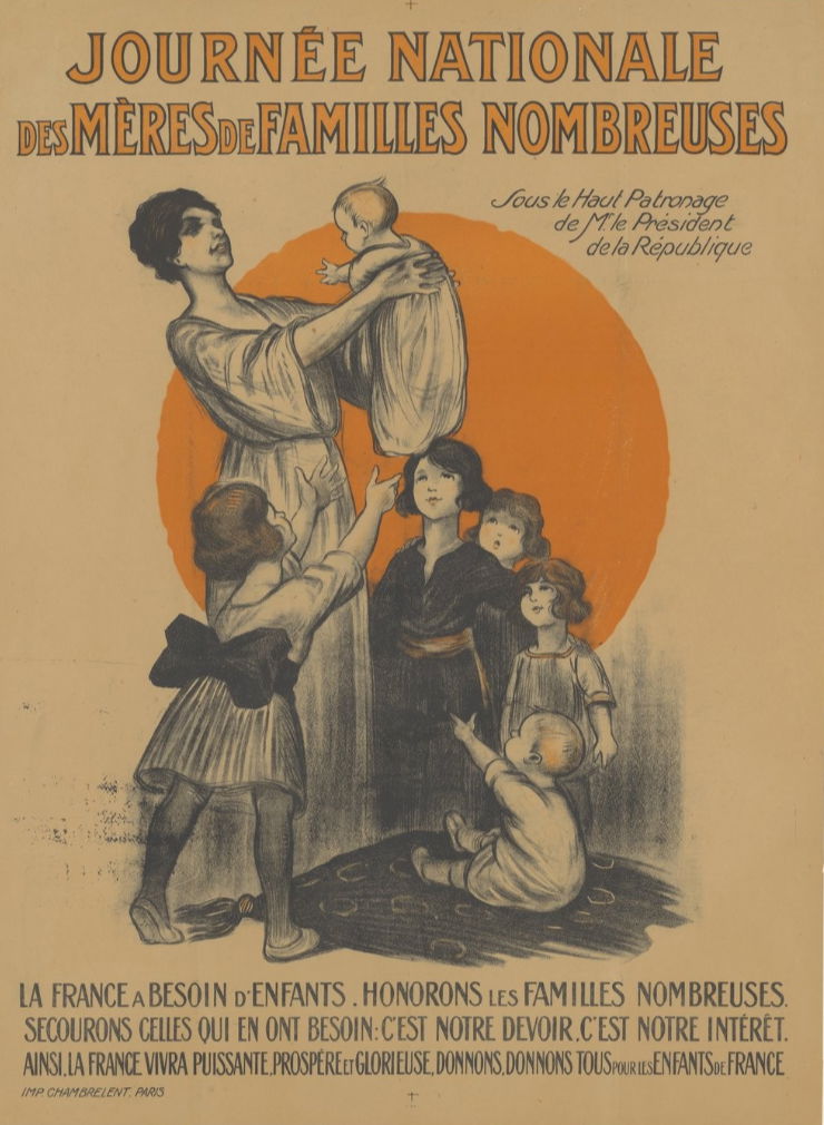 Journée nationale des mères de familles nombreuses ... La France a besoin d'enfants, honorons les familles nombreuses, .., donnons tous pour les enfants de France. Affiche] non signée. 1918. Source gallica.bnf.fr / BnF.