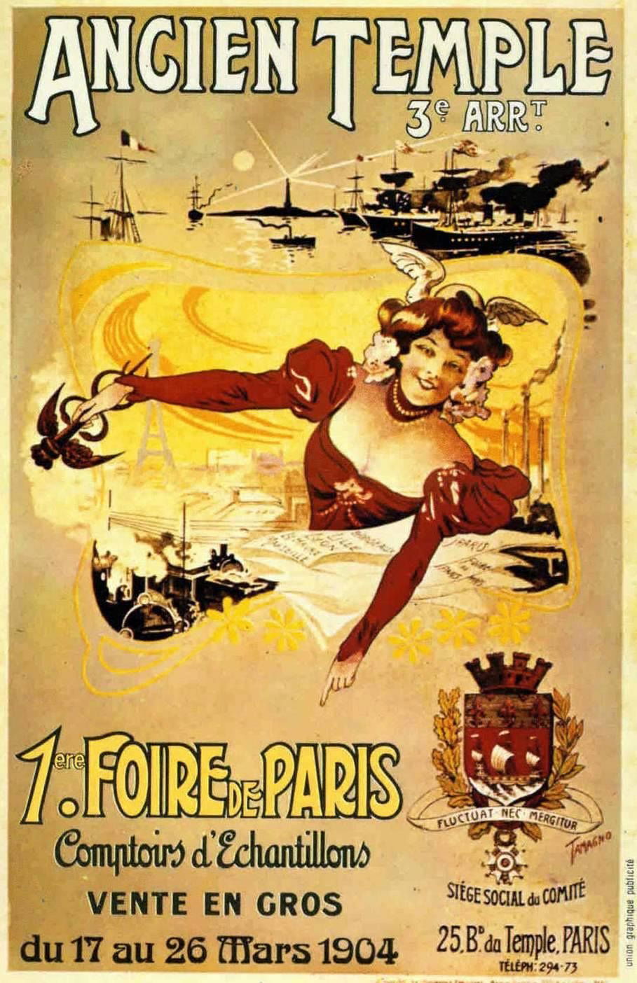 Créée en 1904, la Foire de Paris s’inscrit dans le développement des grandes foires commerciales urbaines du début du XXᵉ siècle. Organisée du 17 au 26 mars 1904 dans le quartier du Temple, elle a pour objectif de rassembler producteurs, industriels et négociants autour de comptoirs d’échantillons et de la vente en gros. Héritière des foires traditionnelles mais pensée selon une logique moderne, elle privilégie la présentation des innovations, la mise en relation professionnelle et la promotion du savoir-faire industriel. Cette première édition marque une étape importante dans la transformation de la foire en événement économique structuré, à la croisée du commerce, de la publicité et du progrès technique, annonçant l’essor futur de la Foire de Paris comme rendez-vous majeur du commerce français.