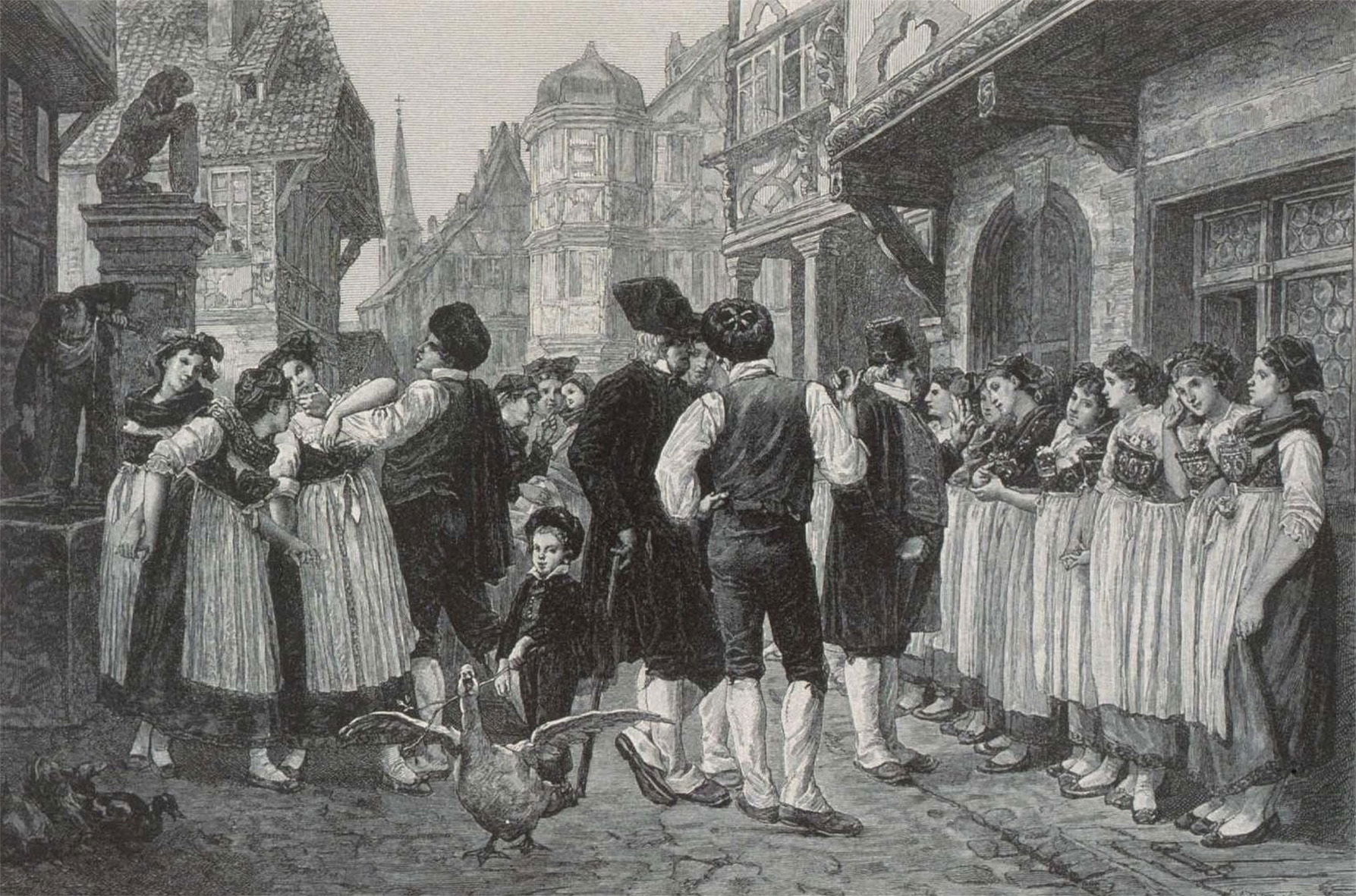 À Bouxwiller, la foire aux servantes, appelée en alsacien Gsindemärik, se tient chaque 27 décembre tout au long du XIXᵉ siècle. Elle constitue un rendez-vous essentiel de la vie rurale, marquant la fin des contrats annuels des ouvriers agricoles et l’ouverture des nouvelles embauches pour l’année suivante. Véritable marché du travail à ciel ouvert, la foire permet aux propriétaires de recruter directement valets de ferme et servantes, tandis que les travailleurs viennent y proposer leurs services. Si sa fonction est d’abord économique, la journée prend aussi un caractère social et festif, rassemblant l’ensemble de la communauté. Cette foire, attestée sur plusieurs décennies — environ 80 à 100 ans, du début du XIXᵉ siècle jusqu’à sa disparition progressive à la fin du siècle ou au début du XXᵉ siècle — est fixée en 1864 par le peintre Charles-François Marchal. Elle témoigne d’une organisation du travail agricole fondée sur le contrat annuel et la rencontre directe entre employeurs et employés, avant l’évolution des modes d’embauche et du droit du travail.