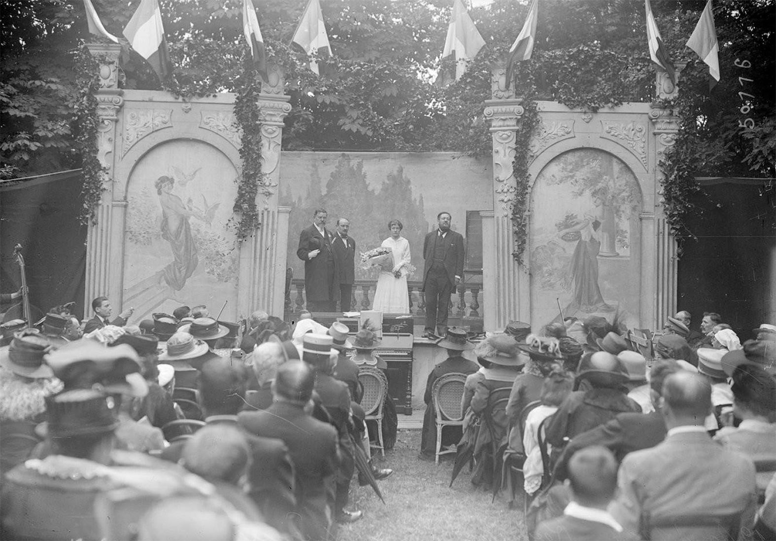 La scène, installée comme un petit théâtre de plein air, est décorée de drapeaux tricolores. Devant un public nombreux et attentif, des notables prennent la parole, tandis qu’une jeune femme en robe claire occupe une place centrale, figure symbolique ou honorée de la fête. Plus que le divertissement, cette kermesse illustre la mobilisation civile et l’importance du spectacle comme lien social en temps de guerre.
