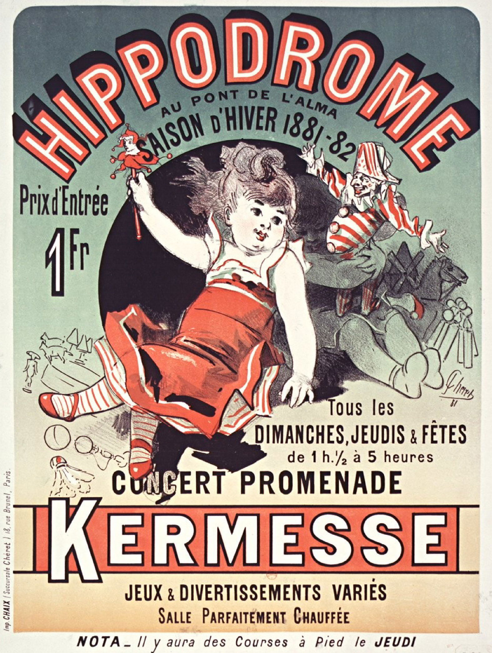 1881–1882 : La kermesse annoncée sur cette affiche se tient à l’Hippodrome au Pont de l'Alma pendant la saison d’hiver 1881–1882. Elle s’inscrit dans une programmation régulière, organisée sur plusieurs mois, et non comme un événement ponctuel. La mention répétée des jours d’ouverture indique une manifestation durable, pensée pour attirer le public tout au long de la saison froide.