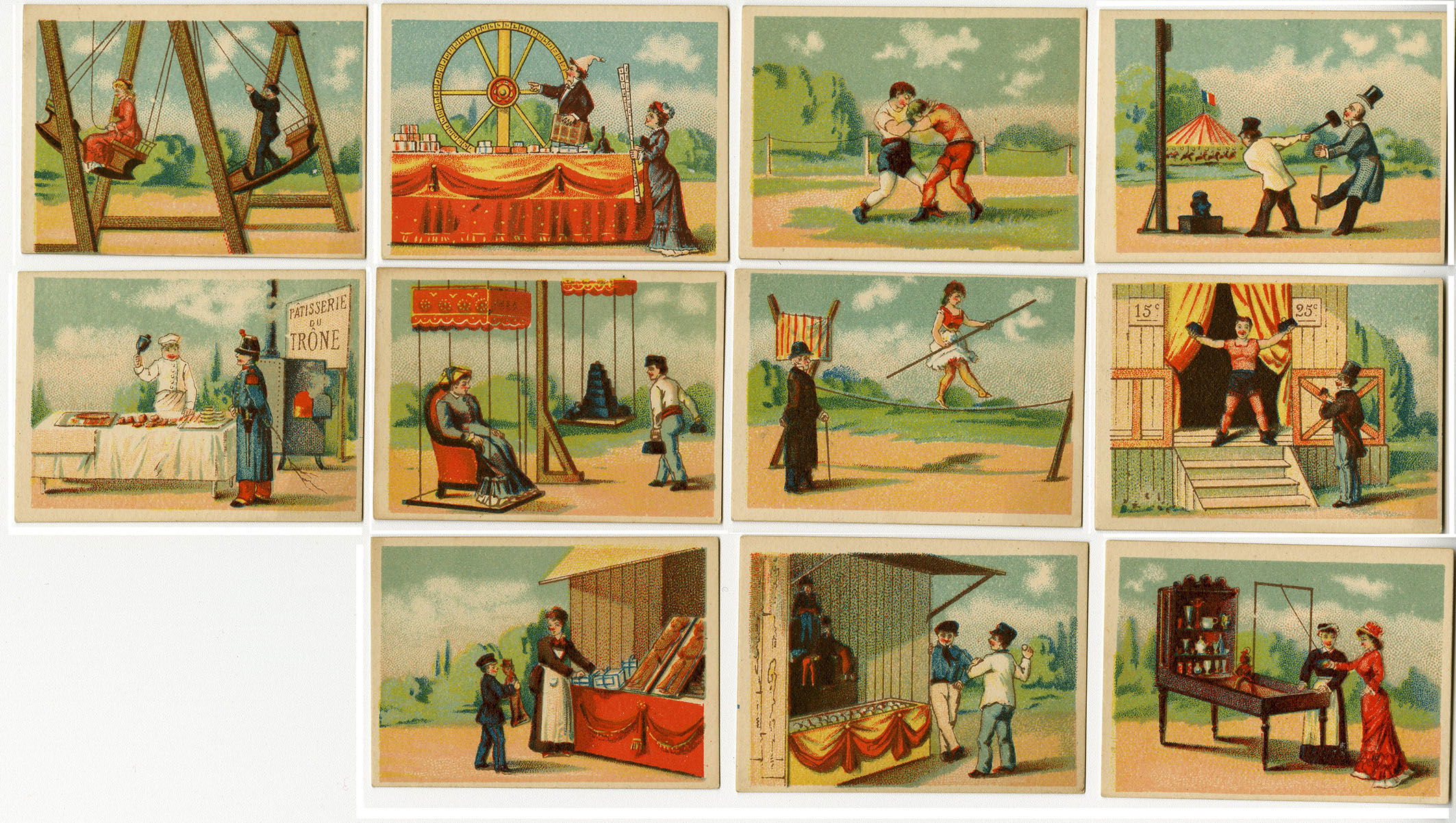 Vignettes de kermesse Cette planche montre une kermesse complète, mêlant hasard, adresse, force, curiosité et petits défis. Elle illustre parfaitement une culture du divertissement populaire fondée sur la participation directe, bien avant la mécanisation massive des fêtes foraines.