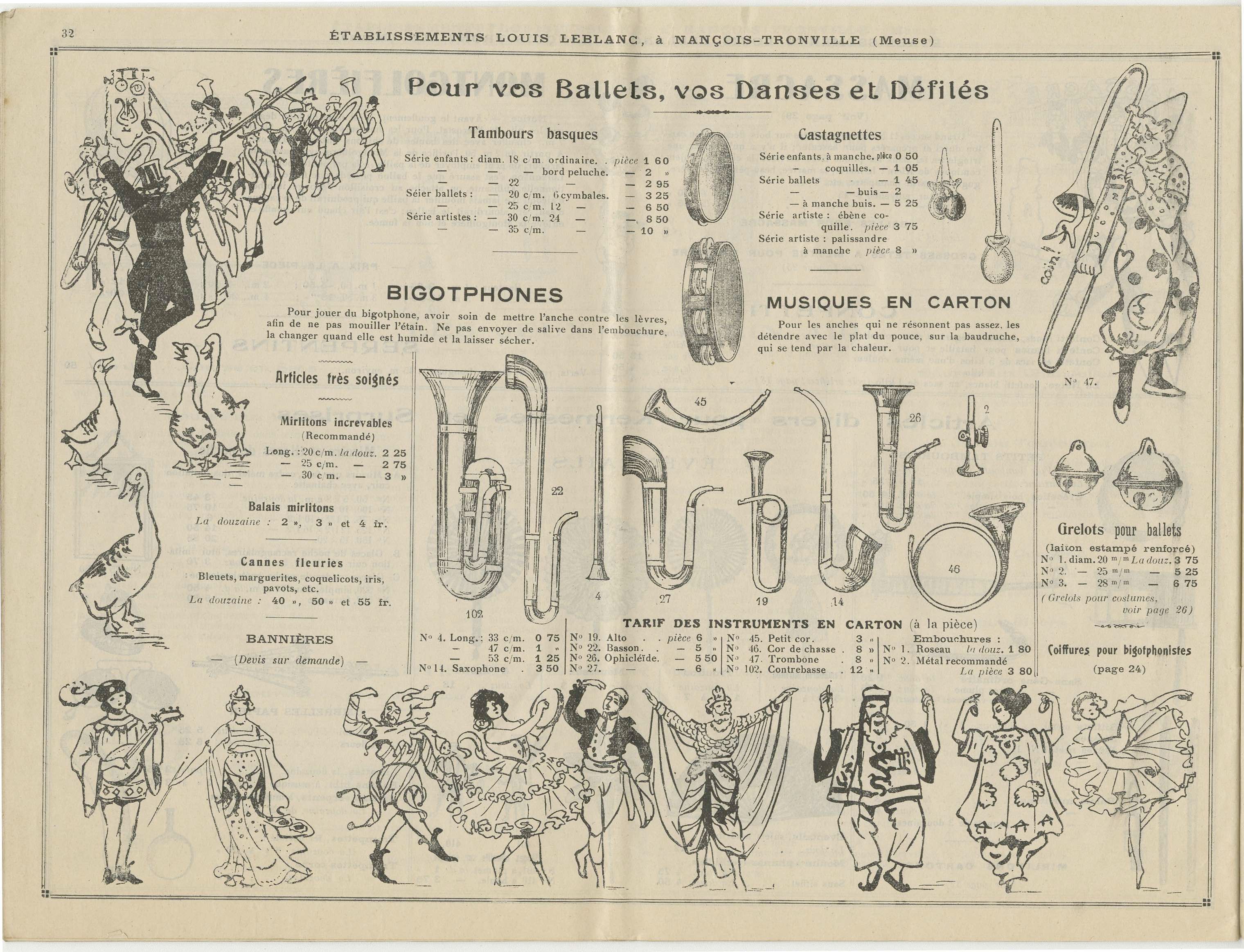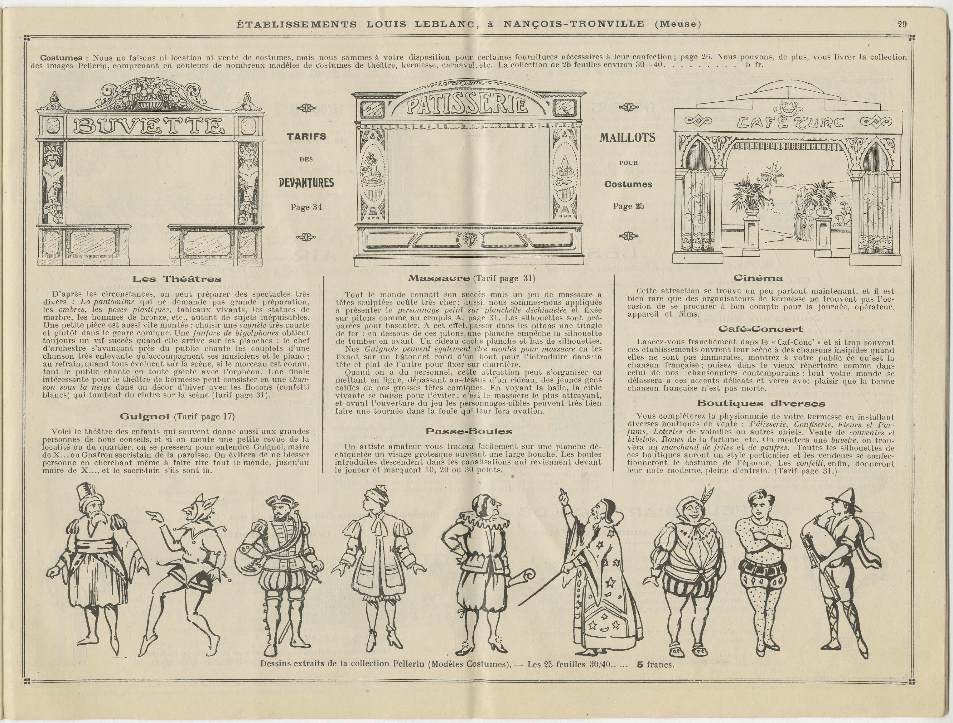 Catalogue Théâtre & Fêtes – 1923-1924 Cet extrait du catalogue des Établissements Louis Leblanc, installés à Nançois-Tronville (Meuse), offre un panorama complet du matériel, des attractions et des décors destinés à l’organisation de kermesses, fêtes locales, spectacles et animations populaires au début des années 1920.
