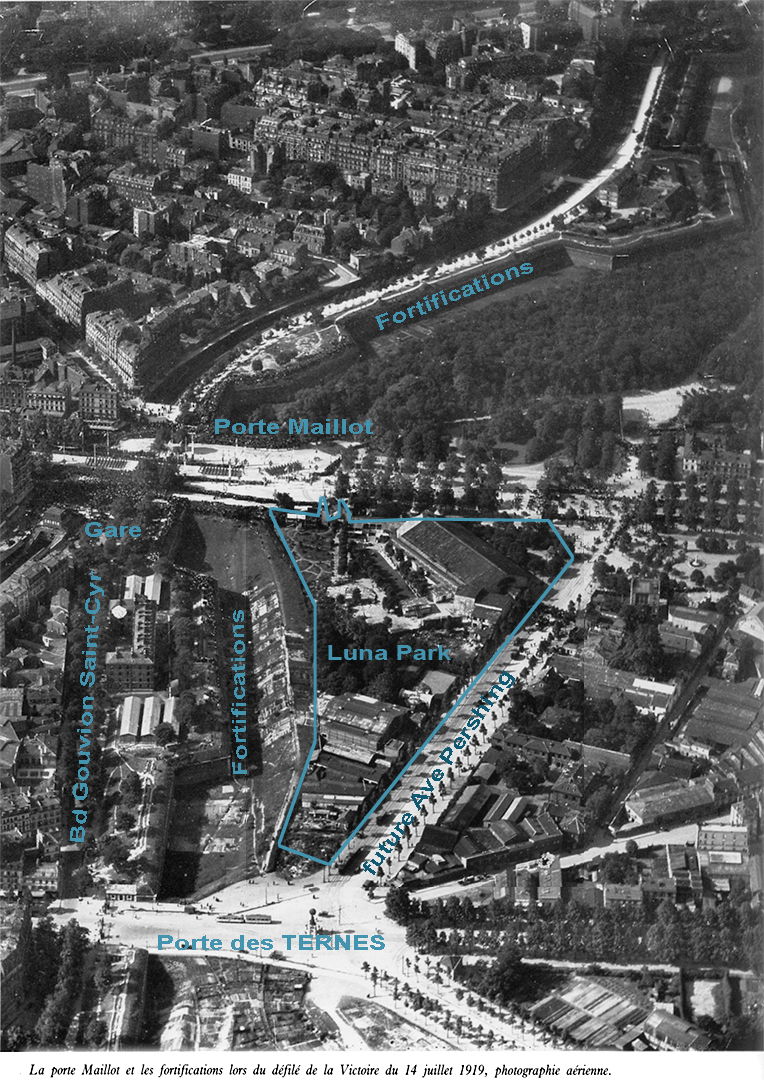 Vue aérienne porte Maillot et Boulevard Pershing défilé de la victoire du 14 juillet 1919 avec repérages des principaux édifices Luna Park. 14-07-1914