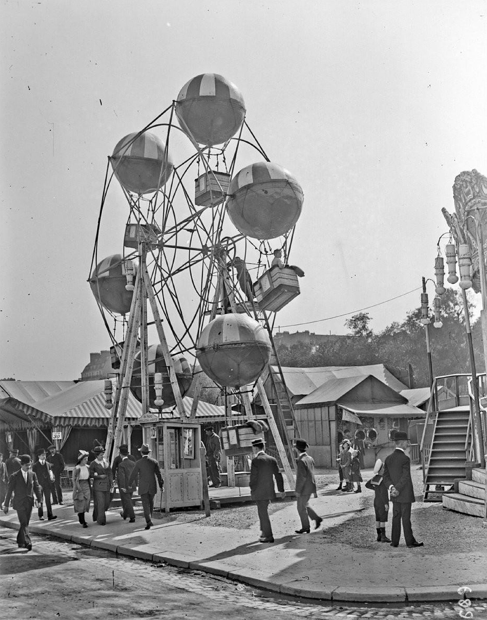Ce type de manège forain mécanique apparaît à la fin du XIXᵉ siècle et se diffuse largement entre 1900 et 1920 dans les fêtes foraines urbaines et les grandes foires européennes. Il se compose d’une structure métallique centrale autour de laquelle tournent des nacelles suspendues, souvent abritées par des enveloppes sphériques évoquant des ballons ou des aéronefs. Le mouvement combine rotation et élévation progressive, offrant aux passagers une sensation de hauteur et de balancement. Installé de manière temporaire, ce manège s’inscrit pleinement dans l’esthétique de la modernité foraine, nourrie par l’imaginaire de l’aviation et des débuts de la conquête de l’air. À Paris, ces manèges sont couramment visibles dans les fêtes foraines au début du XXᵉ siècle, notamment dans les quartiers populaires et lors des grandes manifestations festives.