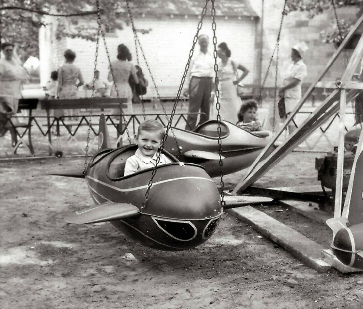 Suspendu à quelques chaînes, l’avion tourne en cercle et l’enfant sourit. Ce n’est pas un vrai vol, mais cela y ressemble assez pour que l’imaginaire s’emballe. À hauteur de regard, le monde devient piste d’atterrissage, et le square se change en ciel. Ces manèges offraient aux enfants (et aux parents) leur première aventure aérienne : un tour de piste, un vent léger sur le visage, la sensation fragile de quitter la terre. On n’allait pas loin, mais on partait déjà. Le jeu faisait de chacun un pilote, et du quotidien un territoire d’envol. Construit autour d’un mât central, le manège faisait tourner de petits avions suspendus par des chaînes, qui s’élevaient doucement sous l’effet de la rotation. Apparues au milieu du XXᵉ siècle dans les fêtes foraines, les jardins publics et les kermesses de quartier, ces attractions traduisaient la fascination collective pour l’aviation en expérience enfantine. Les carlingues, souvent peintes de couleurs vives et inspirées des avions réels, transformaient un simple mouvement circulaire en promesse de voyage. C’était un vol miniature, accessible à tous, où la mécanique se faisait discrète pour laisser place à la rêverie.