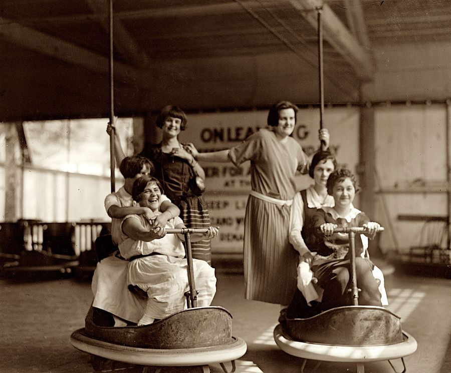 Glen Echo Park. Washington. Cette photographie de 1926 montre les premières autos tamponneuses du parc, utilisées par six clients du parc de l'époque.