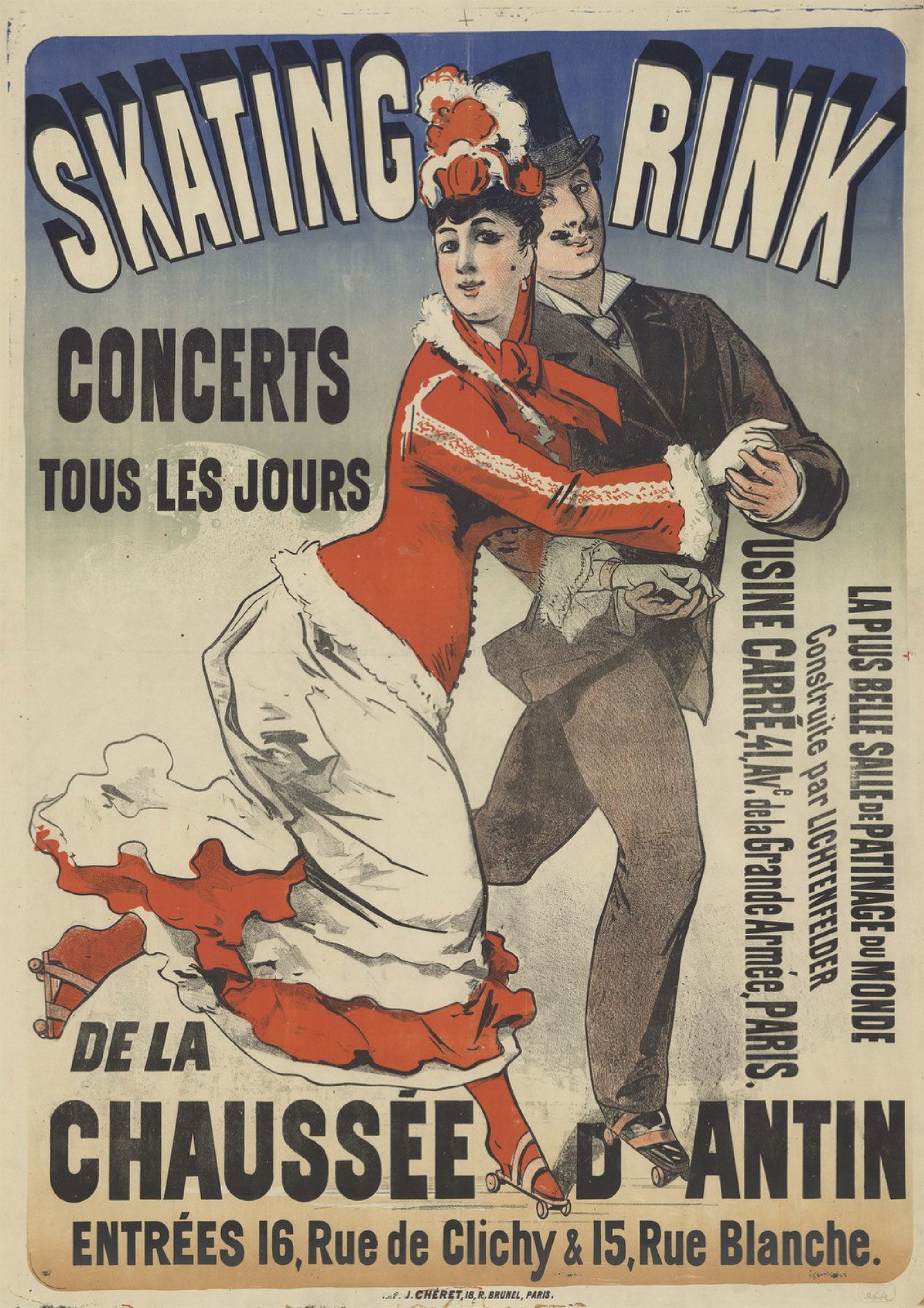 Skating rink de la Chaussée d'Antin, entrées 16, rue de Clichy et 15 rue Blanche. Concert tous les jours... Affiche. 1876. Jules Chéret (1836-1932). Illustrateur. Source gallica.bnf.fr / BnF