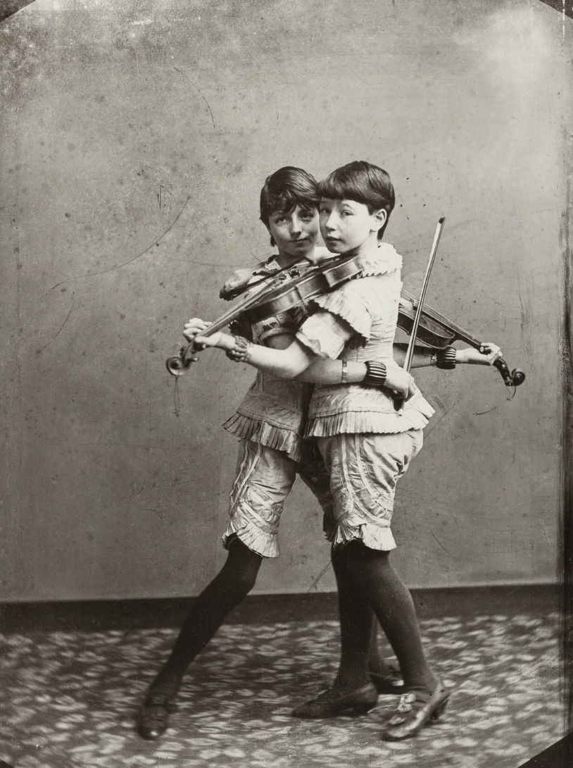 Deux violonistes, duo dynamique , vers 1900. Photographie de studio. Artiste inconnu.