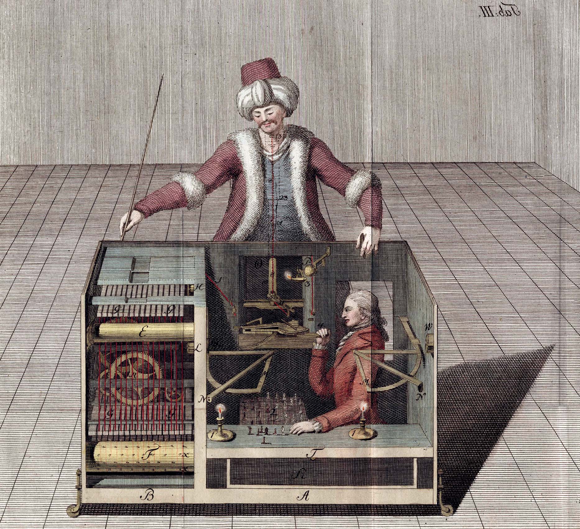 1783 : Paris bruisse d’une rumeur singulière. Une machine venue de Vienne joue aux échecs. Non pas un simple mécanisme d’horlogerie, mais une figure d’homme, grandeur naturelle, vêtue à la turque, assise derrière une commode surmontée d’un échiquier. On l’appelle le Joueur d’échecs automate, ou plus simplement le Turc. L’inventeur est un gentilhomme hongrois, Wolfgang von Kempelen (1734–1804), esprit ingénieux et homme des Lumières. À Paris, la machine est présentée par un certain Anthon. Le Journal de Paris en donne une description détaillée : avant chaque partie, l’exhibiteur ouvre les portes de la commode pour en dévoiler l’intérieur. Le public y découvre un enchevêtrement de rouages, leviers, cylindres, ressorts et cadrans. Tout semble visible. Rien ne paraît caché.