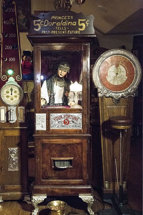 Princess Doraldina est une figure de voyante mécanique apparue aux États-Unis vers 1920–1930, destinée aux galeries d’arcade et aux lieux de divertissement populaires. Elle est représentée en costume orientalisant, richement parée, avec un visage finement maquillé et un regard fixe destiné à capter celui du passant. Son nom, inscrit au-dessus d’elle, lui donne une identité presque aristocratique. Elle promet une lecture complète du passé, du présent et de l’avenir pour 5 cents. Figure emblématique de l’Amérique des années 1920, Princess Doraldina incarne ce mélange de mystère exotique et de modernité mécanique propre aux attractions populaires de cette époque.