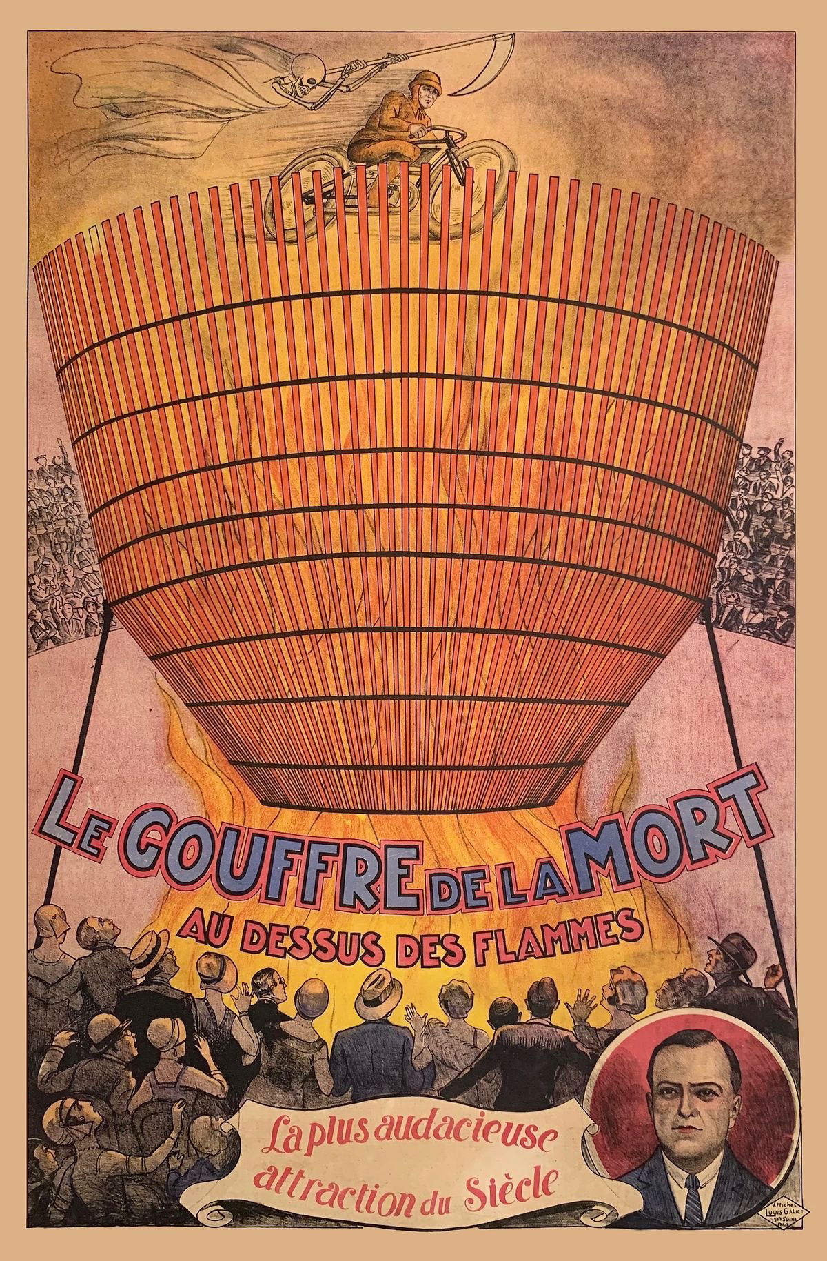 Le Gouffre de la Mort – Au-dessus des flammes est une attraction de sensation extrême du début du XXᵉ siècle, dans laquelle un pilote lance sa moto à pleine vitesse à l’intérieur d’un cylindre vertical, se maintenant par la seule force centrifuge, tandis qu’un brasier brûle au fond du puits. Présenté comme « la plus audacieuse attraction du siècle », ce numéro spectaculaire joue sur la vitesse, le feu et le danger immédiat, transformant la prouesse mécanique en véritable épreuve de vertige pour l’artiste comme pour le public.