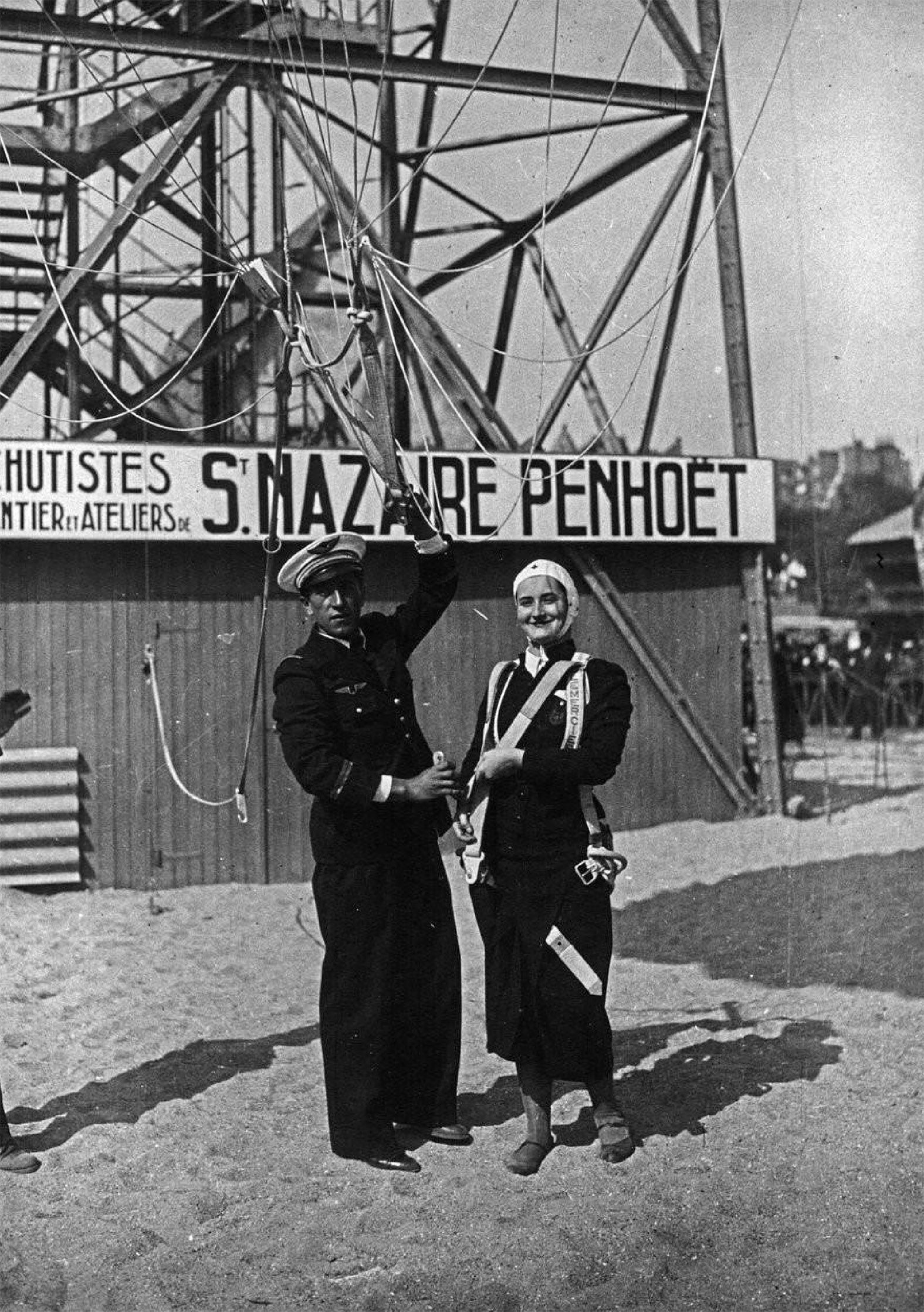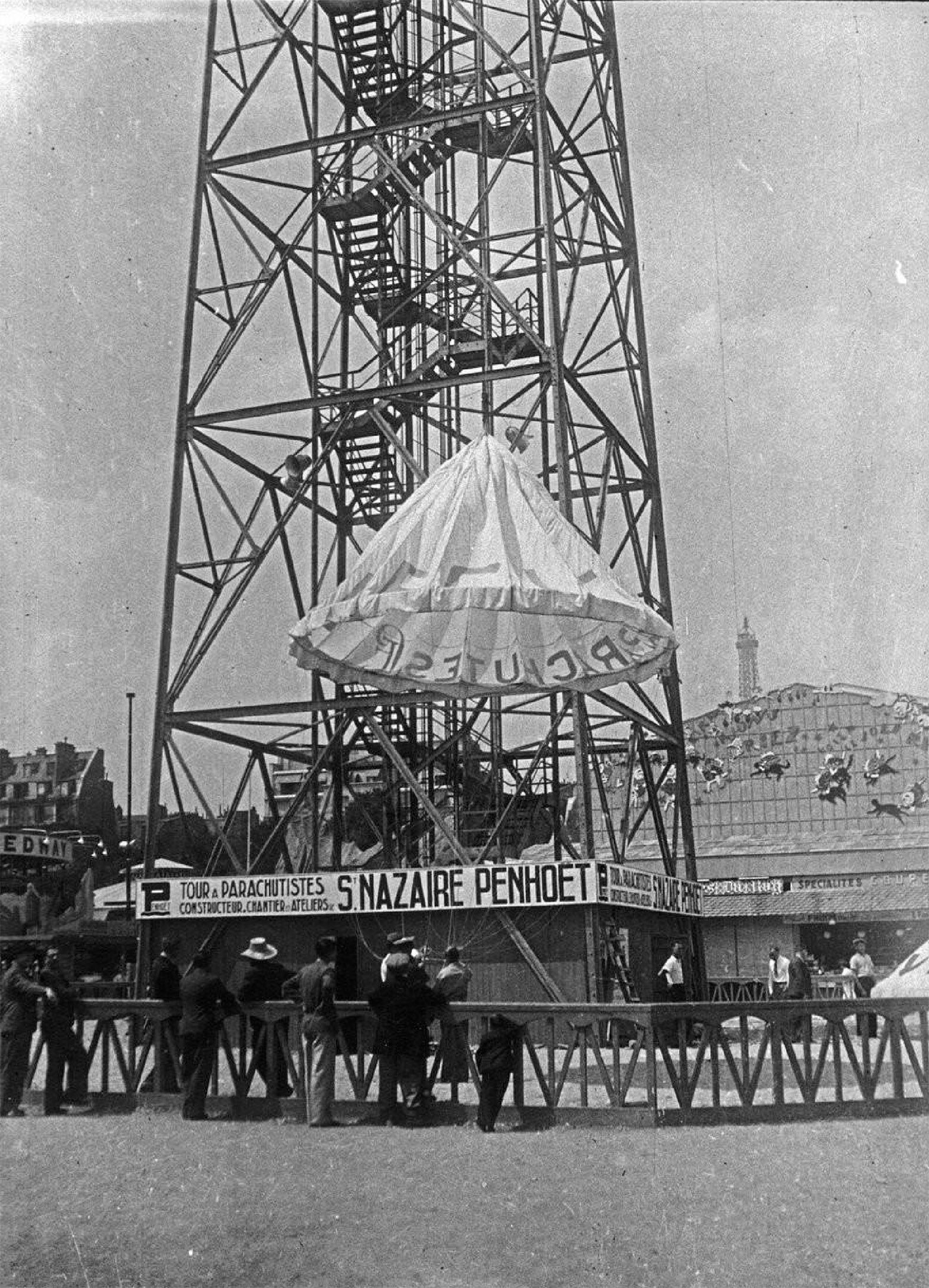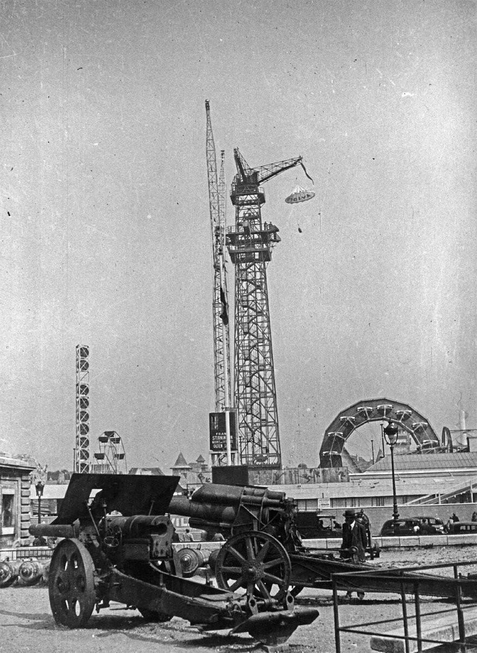 (Exposition internationale des arts et techniques, Paris 1937 Le saut en parachute du parc d'attractions : photographie de presse. 1937. Source gallica.bnf.fr )