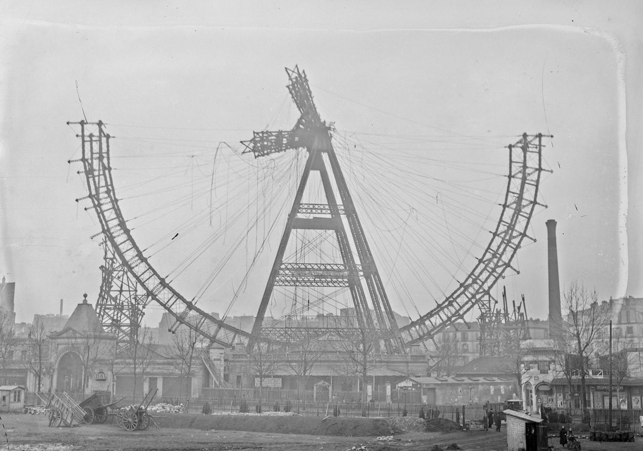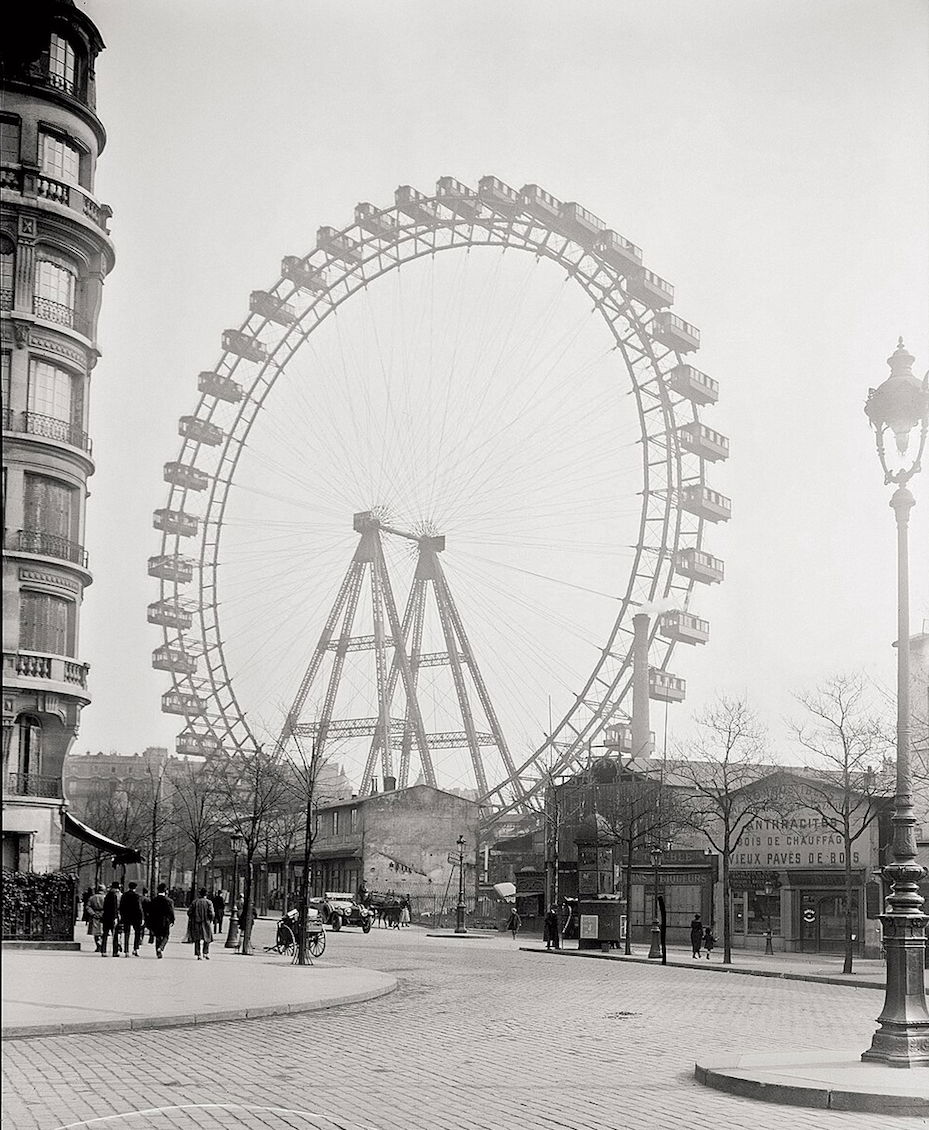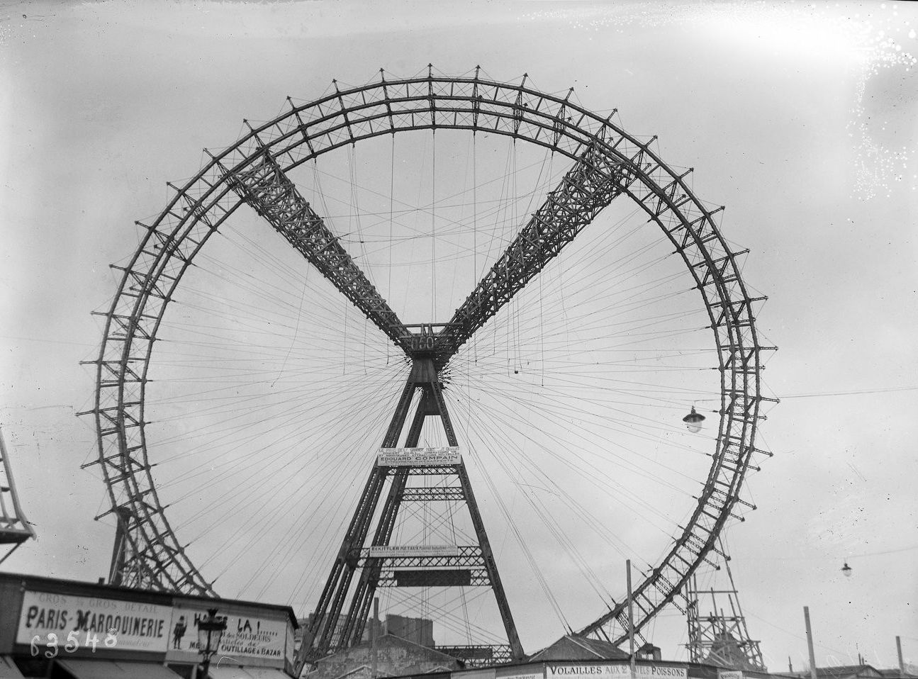 La Grande Roue de Paris est construite spécialement pour l’Exposition universelle de 1900, dans un contexte de rivalité technologique et symbolique entre les grandes nations industrielles. Elle est inaugurée en avril 1900 et installée avenue de Suffren, en face de la Galerie des Machines, à l’emplacement de l’actuel Village Suisse, à proximité immédiate du Champ-de-Mars et de la tour Eiffel.