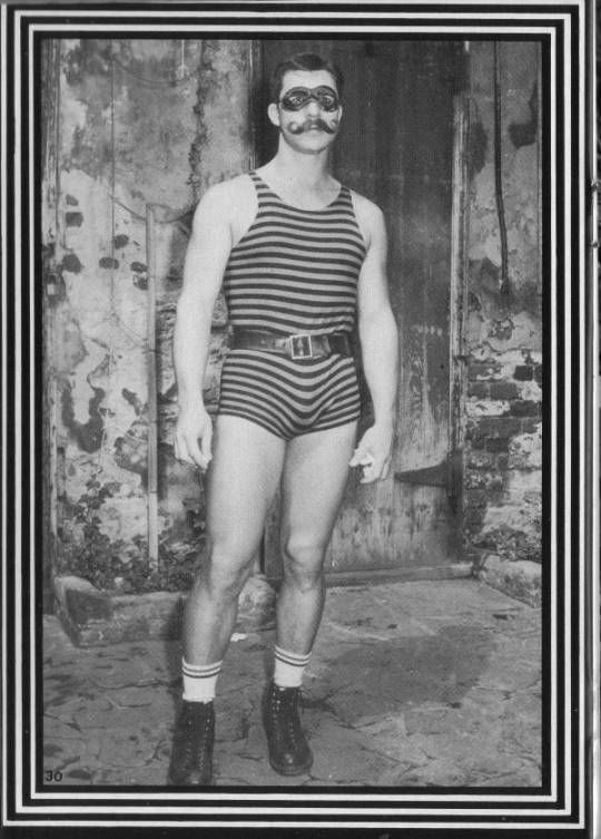Il est considéré comme l'un des premiers athlètes à avoir mis l'accent sur la définition musculaire et l'esthétique du corps, plutôt que sur la seule force brute. Sur cette photo, on reconnaît son style caractéristique, avec sa moustache soignée et son costume de scène rayé. Il portait parfois un masque, comme ici, pour ajouter une touche de mystère à ses performances.