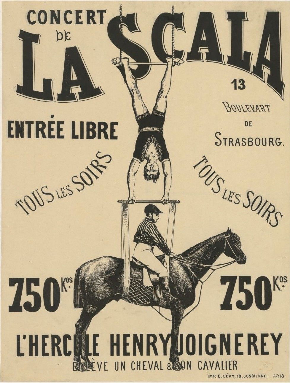 Cette affiche annonce un spectacle de force présenté au Concert de la Scala, situé boulevard de Strasbourg à Paris, à la fin du XIXᵉ siècle. Elle met en avant Henry Joignerey, surnommé « l’Hercule », réalisant un numéro spectaculaire consistant à soulever un cheval et son cavalier, pour un poids annoncé de 750 kilos.