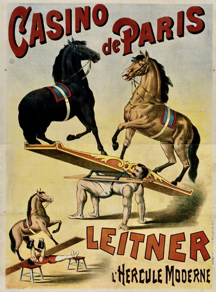 Affiche vers 1900 annonçant Leitner, “l’Hercule moderne”, présenté au Casino de Paris. Par une mise en scène spectaculaire montrant l’homme de force soutenant des chevaux cabrés, cette illustration incarne le goût du sensationnel et la fascination pour les prouesses physiques dans les spectacles parisiens de la fin du XIXᵉ siècle.