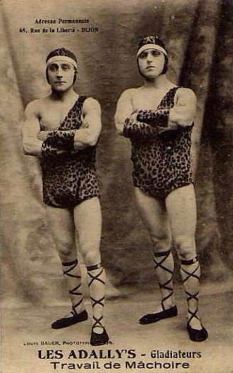 Actifs au tournant du XXe siècle, Les Adally's étaient des attractions populaires des cirques et music-halls européens. Originaire de Dijon, comme l'indique l'adresse permanente sur la carte postale (68, rue de la Liberté), ce duo se présentait sous l'esthétique antique des « Gladiateurs ». Contrairement aux athlètes soulevant des poids avec leurs bras ou leur dos, leur numéro était basé sur une force dentaire et cervicale phénoménale :