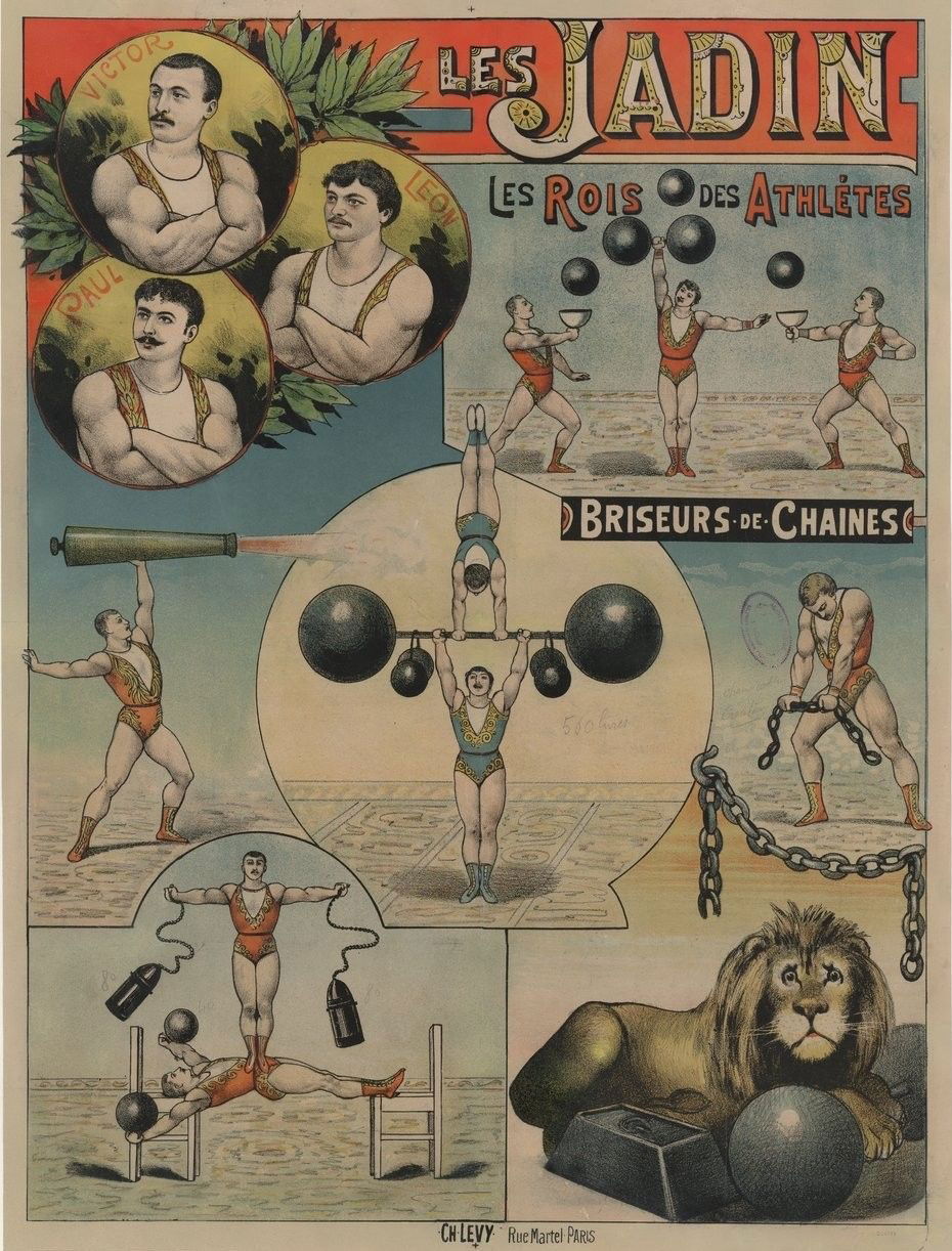 Par son graphisme et ses chiffres impressionnants, l’affiche illustre parfaitement le sensationnalisme et l’esthétique héroïque des spectacles de force de la Belle Époque.