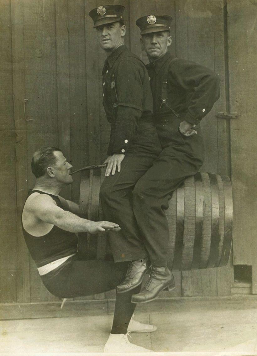 Photographie réalisée à la fin du XIXᵉ siècle, représentant Louis Cyr lors d’une démonstration publique de force. L’image montre l’athlète supportant le poids de deux policiers assis sur un tonneau, utilisés à la fois comme charge réelle et comme témoins de l’exploit. Ce type de photographie avait pour fonction de documenter et d’attester visuellement les performances exceptionnelles, à une époque où l’image servait de preuve auprès du public. Entre spectacle et démonstration, ce document illustre le recours croissant à la photographie pour fixer et authentifier les exploits physiques hors normes.