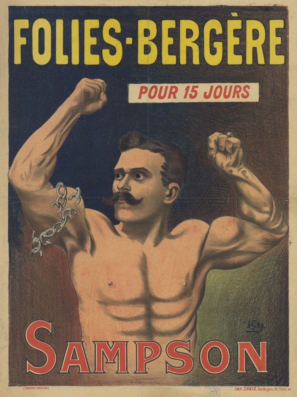 Charles Denis Vichot (1876-1945), un célèbre homme fort français qui se produisait sous le nom de scène de « Sampson ». Dans les années 1900, il était l'une des attractions phares des Folies-Bergère à Paris, où il présentait ses exploits pendant des séries de représentations comme celle indiquée sur l'affiche.