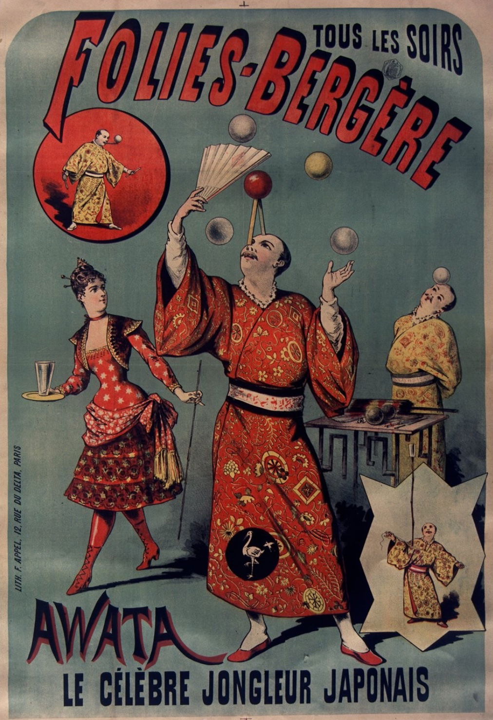 Cette affiche, réalisée vers la fin des années 1890, annonce les représentations d’Awata aux Folies-Bergère, où il est programmé tous les soirs. Elle le montre exécutant un numéro de jonglerie sophistiqué, entouré d’accessoires et vêtu d’un costume orientaliste richement décoré. L’image illustre parfaitement l’esthétique publicitaire de la Belle Époque, mêlant virtuosité circassienne, fascination pour l’exotisme et culture du spectacle de masse à la veille du XXᵉ siècle.