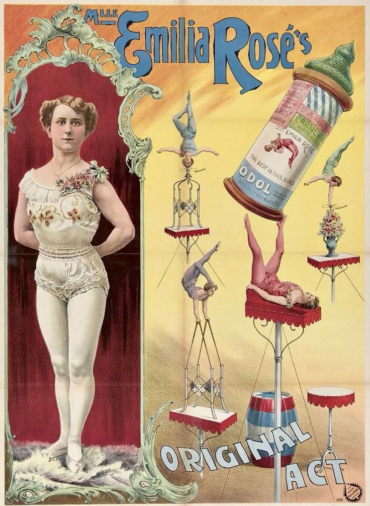 À la fin du XIXᵉ siècle, lorsque les scènes européennes vibrent au rythme de la Belle Époque, Emilia Rose s’impose comme l’une des artistes les plus singulières et admirées de son temps. Vers 1895, son nom brille au sommet des affiches de music-halls et de cirques, porté par une iconographie spectaculaire signée du célèbre imprimeur Adolph Friedländer. Spécialiste de l’antipodisme, cet art rare qui consiste à jongler, équilibrer et manipuler des objets avec les pieds, Emilia Rose défie la gravité avec une aisance troublante. Suspendue entre force et grâce, elle exécute ses numéros dans des postures inversées, offrant au public une vision à la fois audacieuse et d’une grande élégance. Son costume délicatement orné de fleurs, emblématique de la mode des années 1890, accentue encore ce contraste entre prouesse athlétique et raffinement féminin. Mais Emilia Rose ne se contente pas de l’exploit. Visionnaire, elle est l’une des premières artistes à faire dialoguer le cirque et la modernité commerciale. Dès 1893–1895, elle intègre à son numéro un objet inattendu : un flacon géant de l’élixir Odol, produit d’hygiène buccale tout juste lancé en 1892. Manipulé avec une précision vertigineuse, l’objet devient à la fois agrès, curiosité et symbole du progrès. À travers elle, le spectacle populaire se transforme : l’artiste devient image, l’exploit devient réclame, et la piste se fait vitrine du monde moderne. Emilia Rose incarne ainsi une époque où le cirque ne se contentait plus d’émerveiller, mais participait pleinement au rêve, à la nouveauté et à l’imaginaire de son temps.