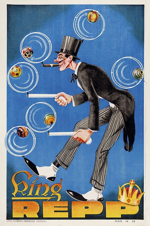 Publicité pour l’artiste King Pepp, représenté en tenue de gentleman caricatural exécutant un numéro de jonglerie comique, avec des balles figurées en rotation graphique.