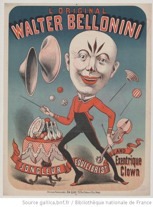 Walter Bellonini est un artiste de cirque européen actif à la fin du XIXᵉ siècle et au début du XXᵉ siècle, reconnu pour un registre pluridisciplinaire mêlant jonglerie, équilibre et clown excentrique. Héritier de la tradition des artistes-complets, il incarne une figure typique du cirque et du music-hall de la Belle Époque, où l’exploit technique se conjugue étroitement au jeu comique et à la transformation corporelle. Son travail repose sur la virtuosité manuelle, la précision gestuelle et une forte présence scénique, utilisant le grotesque, la caricature et la rupture des codes classiques du clown blanc. Il se produit principalement en Europe occidentale, notamment en France, dans les cirques et théâtres de variétés, avec une diffusion internationale par l’image et l’affiche.