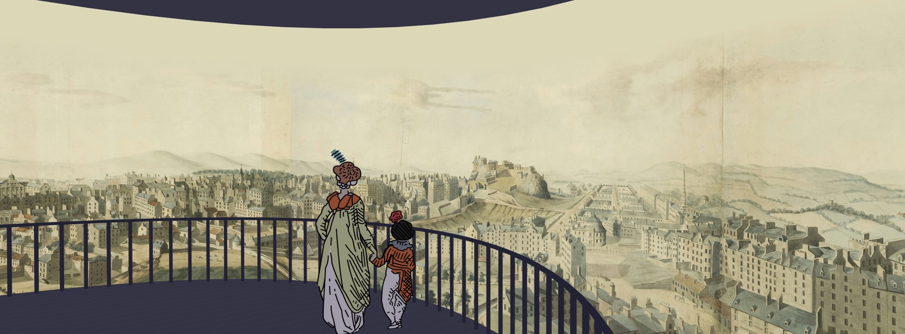 Principe du panorama immersif du XIXᵉ siècle. Depuis une plateforme centrale, les visiteurs observent une immense peinture circulaire représentant une ville ou un paysage, donnant l’illusion d’un point de vue réel à 360°. Reconstitution inspirée des panoramas présentés en Europe au XIXᵉ siècle.