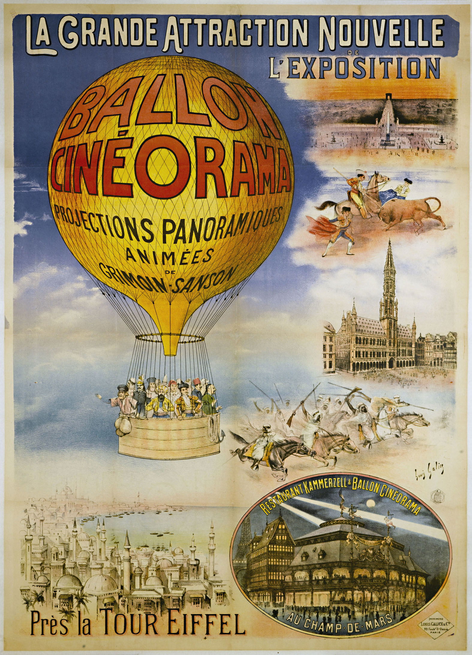 1900. Paris. Affiche du Ballon Cinéorama. Affiche annonçant l’attraction du Cinéorama de Raoul Grimoin-Sanson à l’Exposition universelle de 1900, près de la tour Eiffel, proposant aux visiteurs une projection panoramique simulant un voyage en ballon.