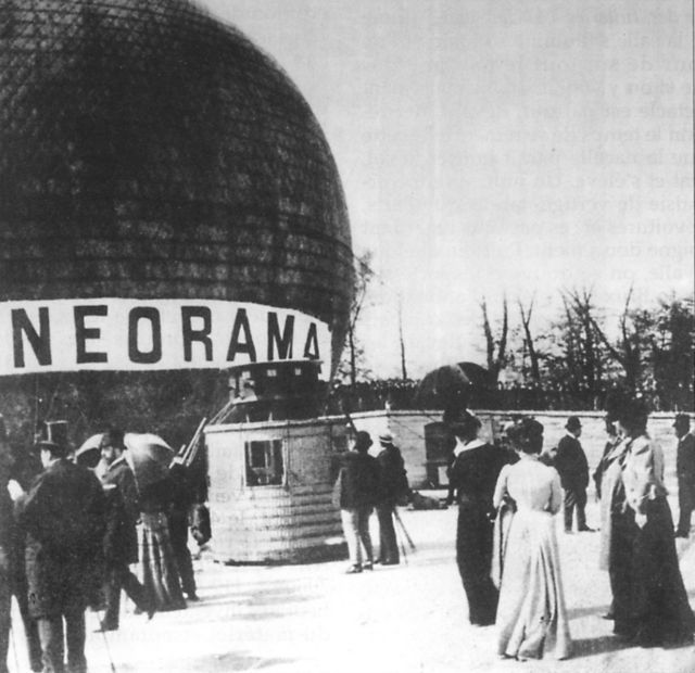 Le Cinéorama est imaginé par l’ingénieur français Raoul Grimoin-Sanson. L’installation propose aux visiteurs une expérience totalement inédite : simuler une ascension en ballon au-dessus de Paris grâce à un dispositif de projection circulaire. Au centre de la salle se trouve une nacelle de ballon reconstituée, dans laquelle prennent place les spectateurs. Tout autour d’eux, sur une toile circulaire géante, sont projetées des images filmées depuis un véritable ballon captif.