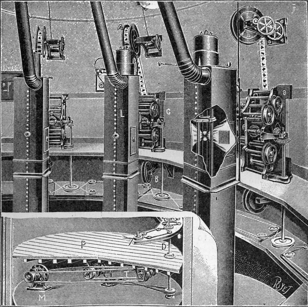 1900 : Paris. Exposition universelle. Dispositif du Cinéorama Cette gravure montre la fosse technique du Cinéorama, conçu par l’ingénieur français Raoul Grimoin-Sanson pour l’Exposition universelle de 1900. Le dispositif reposait sur dix projecteurs disposés en cercle, destinés à projeter simultanément des images sur un écran panoramique de 360 degrés, entourant les spectateurs installés dans une nacelle de ballon afin de simuler une ascension au-dessus de Paris. Les images avaient été filmées depuis un ballon captif.