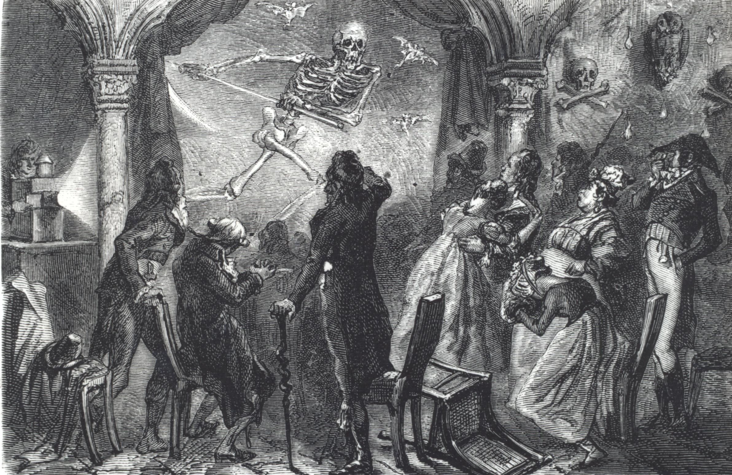 Fantasmagorie avec projection de squelette à l’aide d’une lanterne magique. Gravure du XIXᵉ siècle.