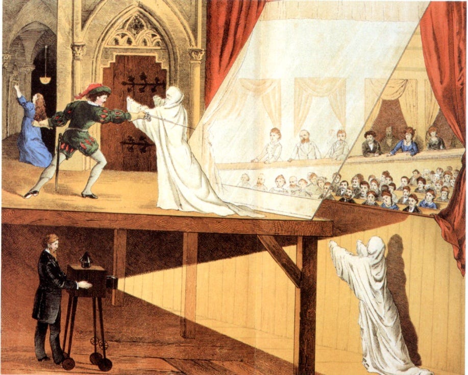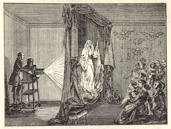 À la fin du XVIIIᵉ siècle et au début du XIXᵉ siècle, l’Europe découvre un type de spectacle spectaculaire fondé sur les illusions d’optique : la fantasmagorie. Ces représentations utilisent la lanterne magique, un appareil de projection permettant d’afficher sur un écran ou dans la fumée des images peintes sur des plaques de verre.