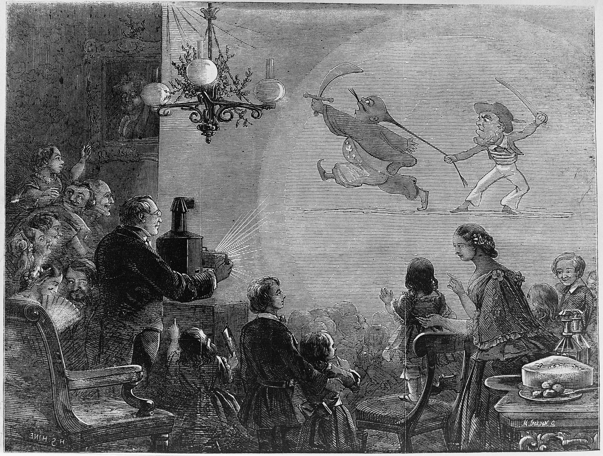 Projection d’images à l’aide d’une lanterne magique devant un public familial. Gravure du XIXᵉ siècle. Source : domaine public.