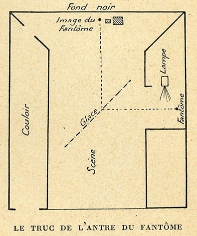 Le principe est relativement simple mais très efficace. Un acteur ou un objet est placé dans un espace caché, généralement sous la scène ou sur le côté. Son image est réfléchie par une grande plaque de verre disposée en biais entre la scène et le public. Selon l’éclairage utilisé, cette image réfléchie apparaît comme une silhouette transparente se mêlant aux décors et aux acteurs présents sur scène. L’effet donne l’impression qu’un fantôme surgit ou disparaît mystérieusement.