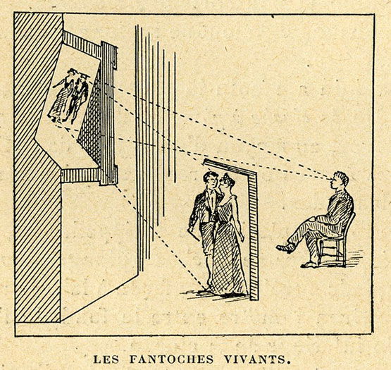 Principe des « Fantoches vivants », illusion scénique utilisant une plaque de verre pour superposer une image réfléchie aux acteurs visibles sur scène.