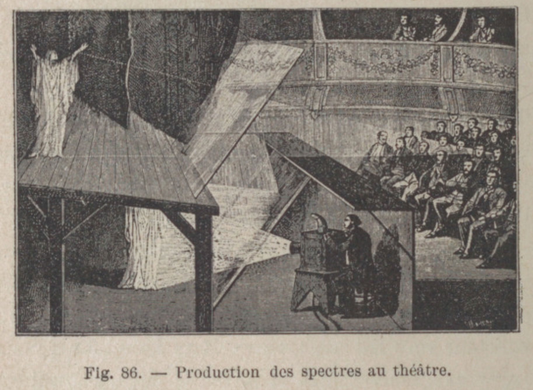 « Ghosts on the Stage » : démonstration du procédé du fantôme de Pepper permettant de faire apparaître un spectre sur scène devant le public. Gravure du XIXᵉ siècle. Source : domaine public.