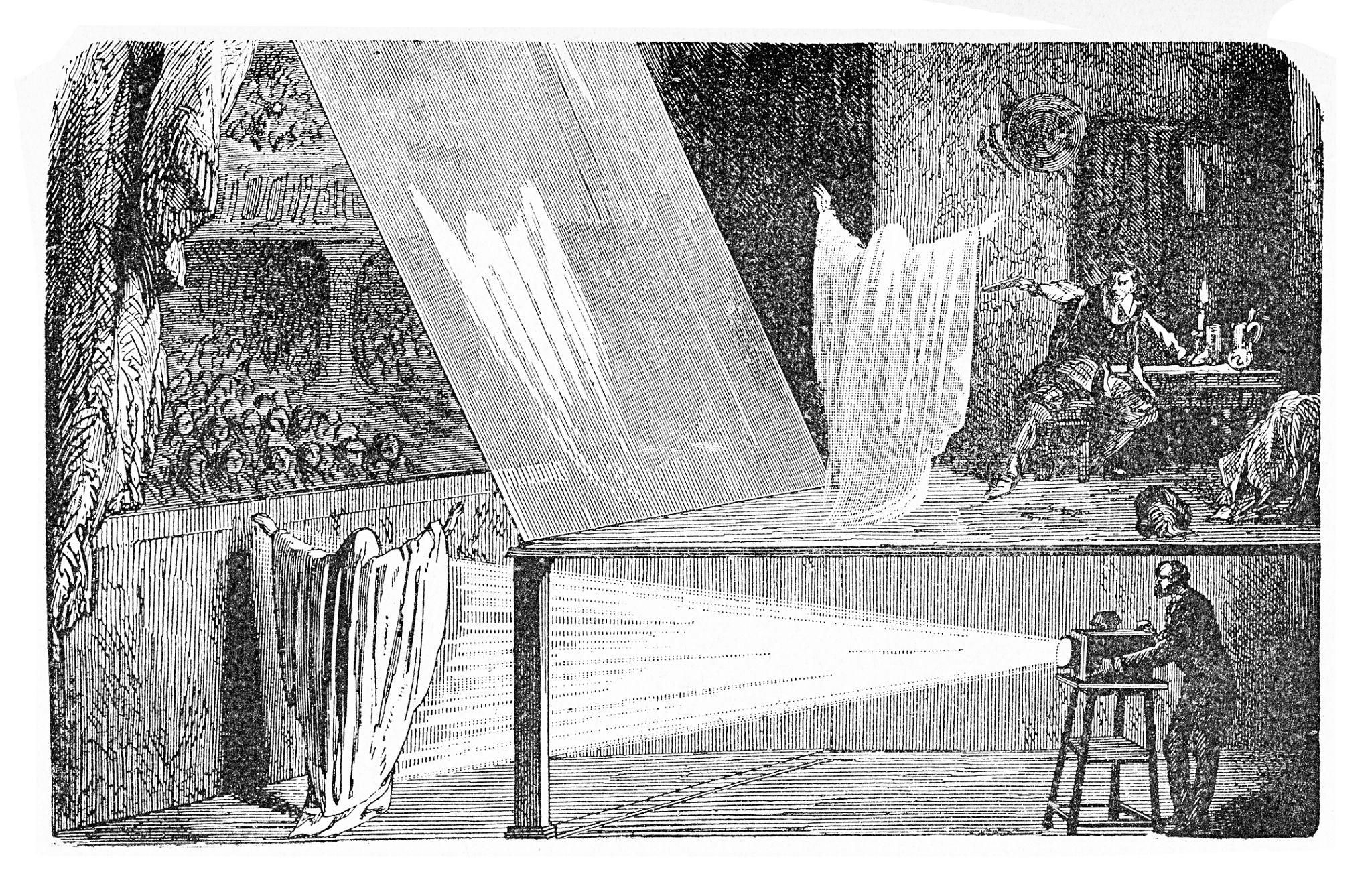 Fantasmagorie avec projection d’apparition à l’aide d’une lanterne magique. Gravure du XIXᵉ siècle. Source : domaine public.