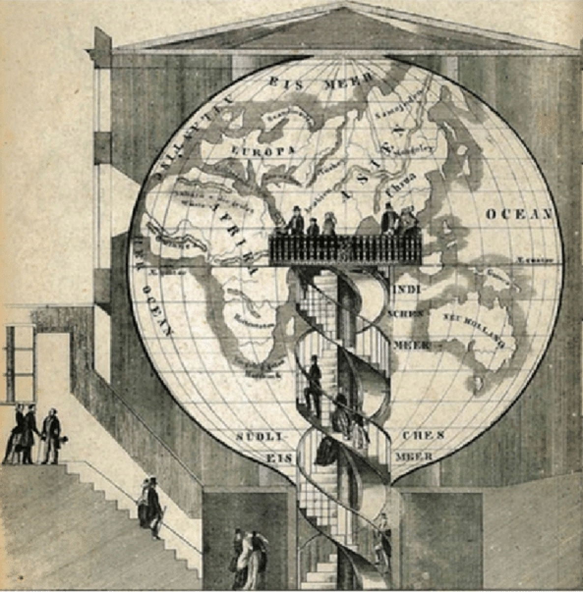 Ce dispositif spectaculaire s’inscrit dans la tradition des géoramas, attractions éducatives qui visaient à faire découvrir la géographie et les grandes explorations. Il prolonge notamment l’expérience du Géorama de Paris (1825), tout en atteignant une dimension beaucoup plus monumentale.