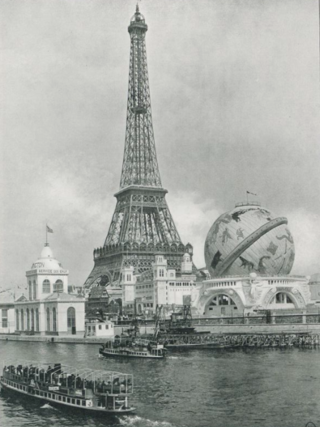 Le Globe Céleste avec la tour Eiffel en toile de fond. Source: Le Panorama : Exposition universelle 1900, Gallica, BnF