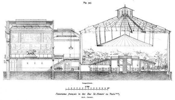Sur le boulevard Montmartre, près du Théâtre des Variétés, plusieurs bâtiments cylindriques sont édifiés afin de présenter ces nouvelles attractions. Ces grandes rotondes, reconnaissables à leurs coupoles circulaires, sont spécialement conçues pour accueillir les toiles monumentales peintes sur toute la circonférence intérieure.