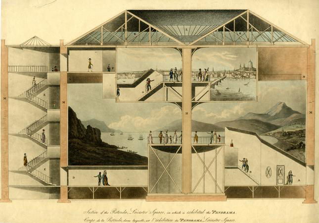 Pour présenter ces immenses peintures, un bâtiment spécifique est construit à Leicester Square, au cœur de Londres. Inaugurée en 1793, la rotonde panoramique devient rapidement une attraction très populaire. Les visiteurs montent par un escalier jusqu’à une plateforme centrale entourée d’une toile monumentale représentant un paysage à 360 degrés. Grâce à une perspective soigneusement calculée et à un éclairage venant du sommet de la coupole, l’image donne l’impression d’un paysage réel.