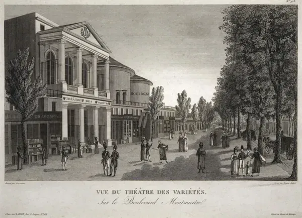 Vue du Théâtre des Variétés et des premières rotondes de panoramas sur le boulevard Montmartre à Paris, vers le début des années 1800. Ces grandes coupoles cylindriques abritaient les panoramas, immenses peintures circulaires immersives présentées au public dans des bâtiments spécialement construits.