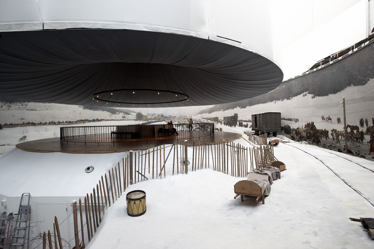 Une partie du bâtiment présente un premier plan reconstitué avec de la neige artificielle, des objets et des éléments de décor destinés à prolonger visuellement la peinture panoramique et à renforcer l’illusion immersive caractéristique des panoramas du XIXᵉ siècle.